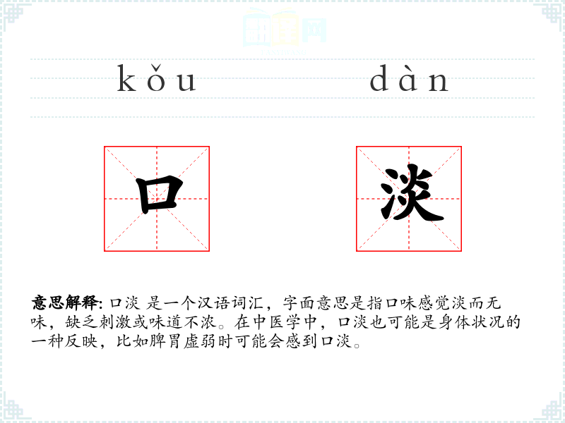 口淡 是一个汉语词汇,字面意思是指口味感觉淡而无味,缺乏刺激或味道不浓。在中医学中,口淡也可能是身体状况的一种反映,比如脾胃虚弱时可能会感到口淡。