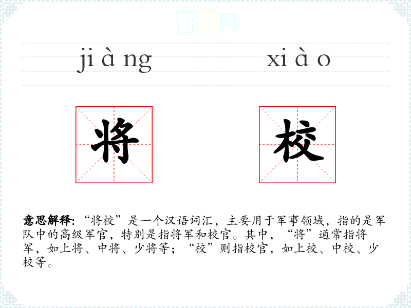 “将校”是一个汉语词汇,主要用于军事领域,指的是军队中的高级军官,特别是指将军和校官。其中,“将”通常指将军,如上将、中将、少将等;“校”则指校官,如上校、中校、少校等。