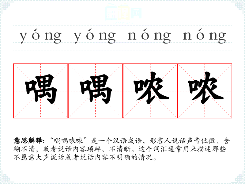 “喁喁哝哝”是一个汉语成语,形容人说话声音低微、含糊不清,或者说话内容琐碎、不清晰。这个词汇通常用来描述那些不愿意大声说话或者说话内容不明确的情况。
