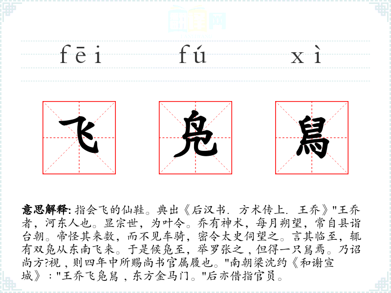 1.指会飞的仙鞋。典出《后汉书.方术传上.王乔》"王乔者,河东人也。显宗世,为叶令。乔有神术,每月朔望,常自县诣台朝。帝怪其来数,而不见车骑,密令太史伺望之。言其临至,辄有双凫从东南飞来。于是候凫至,举罗张之﹐但得一只舃焉。乃诏尚方?视﹐则四年中所赐尚书官属履也。"南朝梁沈约《和谢宣城》﹕"王乔飞凫舃﹐东方金马门。"后亦借指官员。