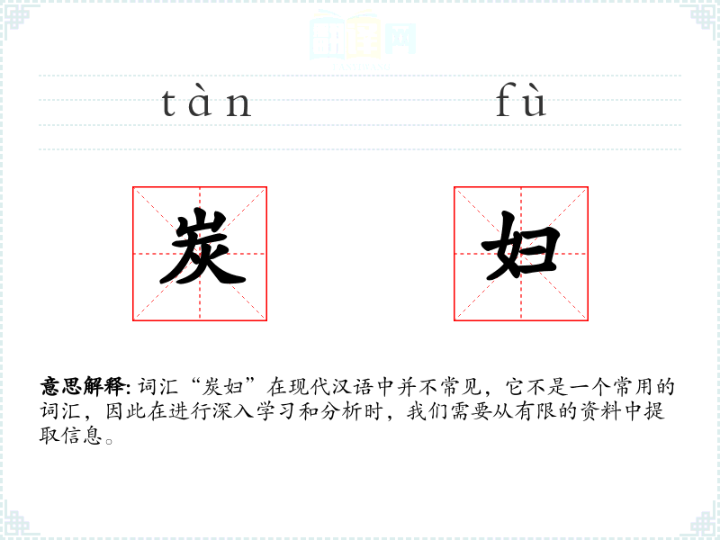 词汇“炭妇”在现代汉语中并不常见,它不是一个常用的词汇,因此在进行深入学习和分析时,我们需要从有限的资料中提取信息。