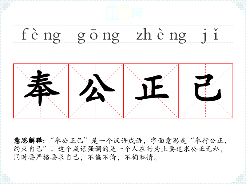 “奉公正己”是一个汉语成语,字面意思是“奉行公正,约束自己”。这个成语强调的是一个人在行为上要追求公正无私,同时要严格要求自己,不偏不倚,不徇私情。