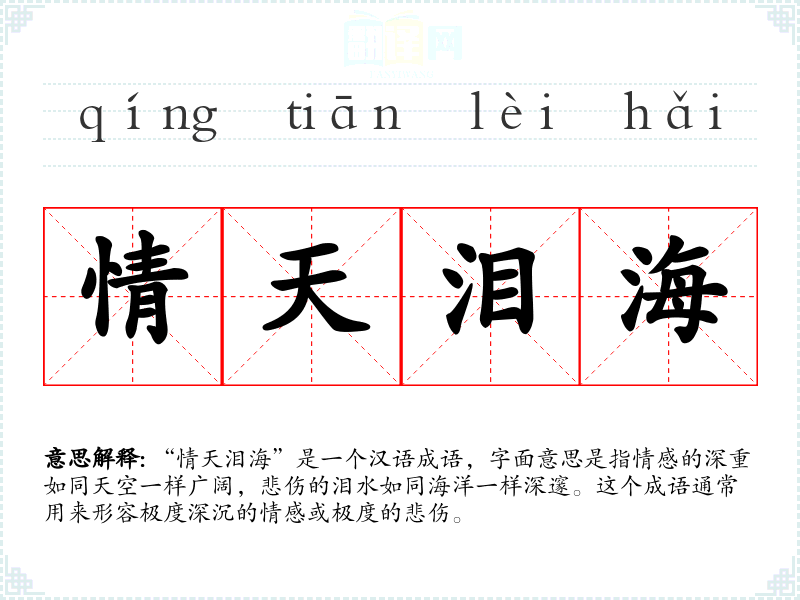 “情天泪海”是一个汉语成语,字面意思是指情感的深重如同天空一样广阔,悲伤的泪水如同海洋一样深邃。这个成语通常用来形容极度深沉的情感或极度的悲伤。