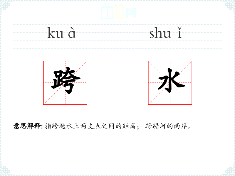 指跨越水上两支点之间的距离; 跨踞河的两岸。