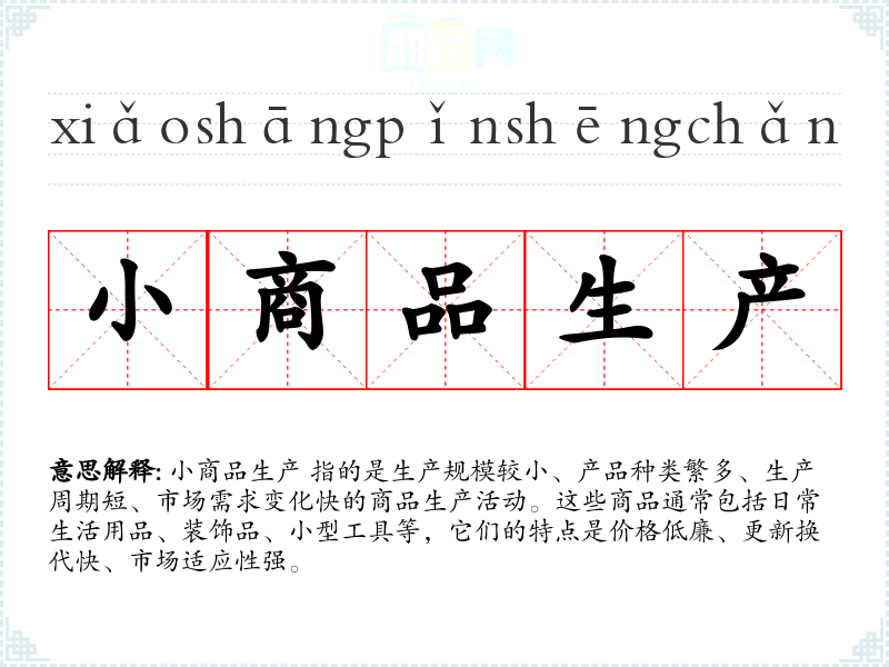 小商品生产 指的是生产规模较小、产品种类繁多、生产周期短、市场需求变化快的商品生产活动。这些商品通常包括日常生活用品、装饰品、小型工具等,它们的特点是价格低廉、更新换代快、市场适应性强。