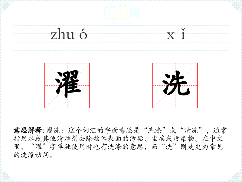 濯洗:这个词汇的字面意思是“洗涤”或“清洗”,通常指用水或其他清洁剂去除物体表面的污垢、尘埃或污染物。在中文里,“濯”字单独使用时也有洗涤的意思,而“洗”则是更为常见的洗涤动词。