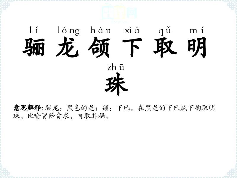 - lí lóng hàn xià qǔ mí zhū骊龙颌下取明珠