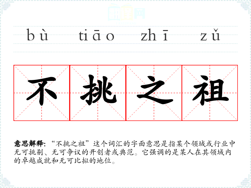 “不挑之祖”这个词汇的字面意思是指某个领域或行业中无可挑剔、无可争议的开创者或典范。它强调的是某人在其领域内的卓越成就和无可比拟的地位。