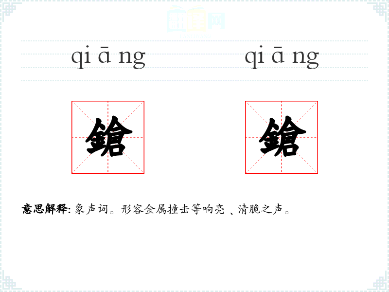 象声词。形容金属撞击等响亮﹑清脆之声。