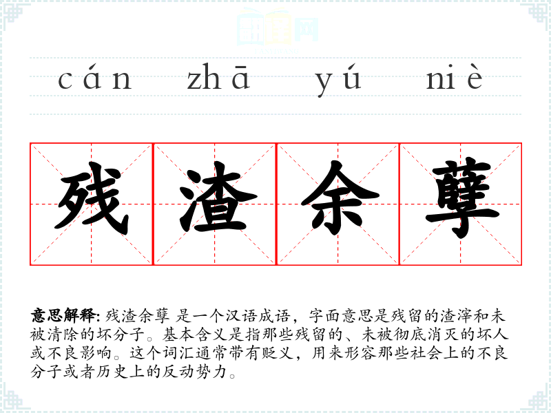 残渣余孽 是一个汉语成语,字面意思是残留的渣滓和未被清除的坏分子。基本含义是指那些残留的、未被彻底消灭的坏人或不良影响。这个词汇通常带有贬义,用来形容那些社会上的不良分子或者历史上的反动势力。