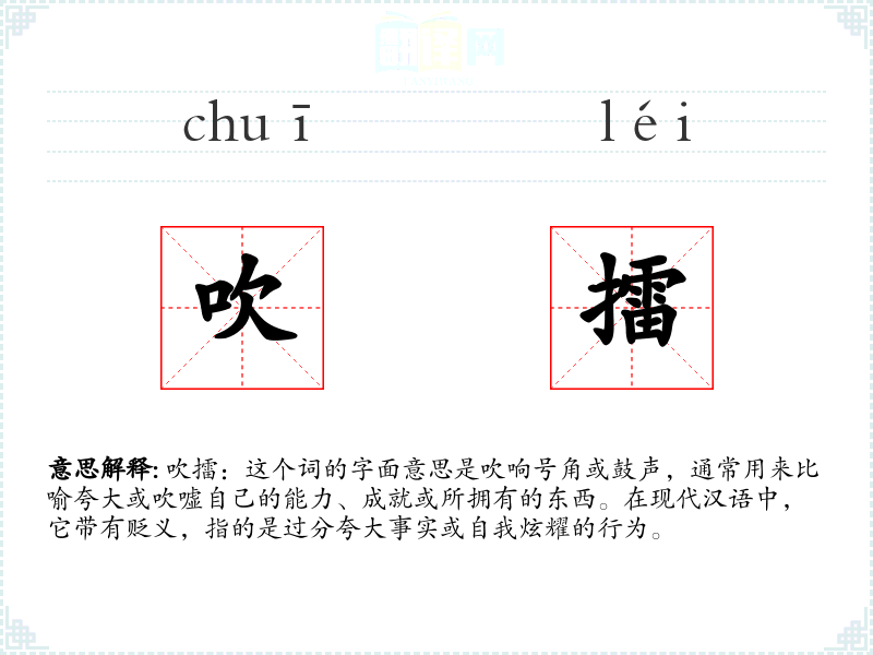 吹擂:这个词的字面意思是吹响号角或鼓声,通常用来比喻夸大或吹嘘自己的能力、成就或所拥有的东西。在现代汉语中,它带有贬义,指的是过分夸大事实或自我炫耀的行为。