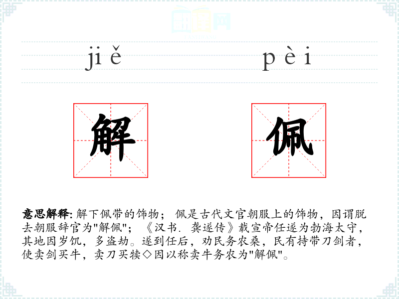 1.解下佩带的饰物; 佩是古代文官朝服上的饰物,因谓脱去朝服辞官为"解佩"; 《汉书.龚遂传》载宣帝任遂为勃海太守,其地因岁饥,多盗劫。遂到任后,劝民务农桑,民有持带刀剑者,使卖剑买牛,卖刀买犊◇因以称卖牛务农为"解佩"。