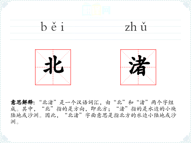 “北渚”是一个汉语词汇,由“北”和“渚”两个字组成。其中,“北”指的是方向,即北方;“渚”指的是水边的小块陆地或沙洲。因此,“北渚”字面意思是指北方的水边小陆地或沙洲。