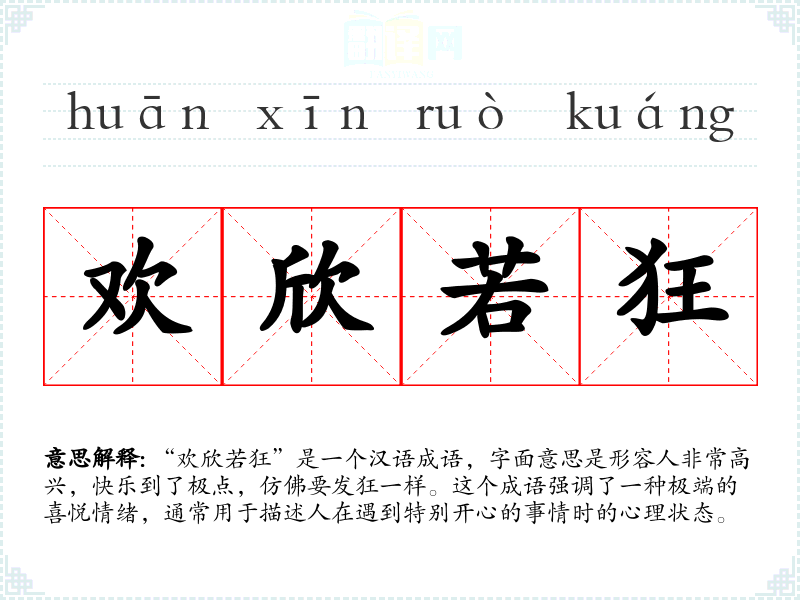 “欢欣若狂”这个成语的词源较为模糊,但它反映了汉语中对于情感表达的丰富性和细腻性。随着时间的推移,这个成语的使用频率可能有所变化,但它始终是描述极端喜悦情绪的有效工具。
