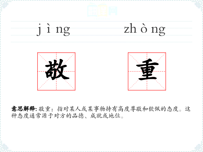 敬重:指对某人或某事物持有高度尊敬和钦佩的态度。这种态度通常源于对方的品德、成就或地位。