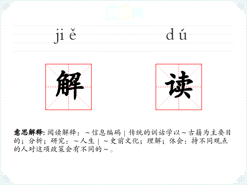 阅读解释:~信息编码|传统的训诂学以~古籍为主要目的;分析;研究:~人生|~史前文化;理解;体会:持不同观点的人对这项政策会有不同的~。