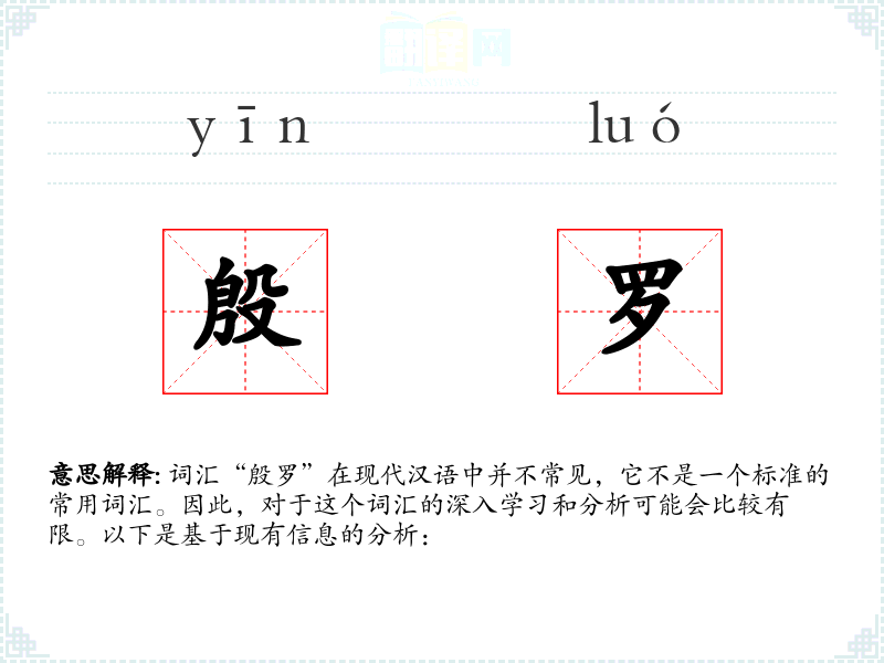 词汇“殷罗”在现代汉语中并不常见,它不是一个标准的常用词汇。因此,对于这个词汇的深入学习和分析可能会比较有限。以下是基于现有信息的分析: