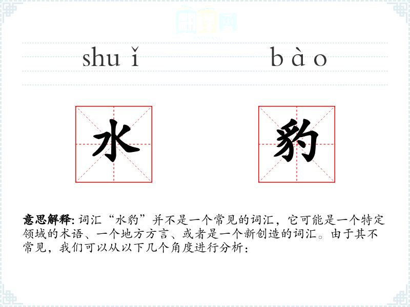 词汇“水豹”并不是一个常见的词汇,它可能是一个特定领域的术语、一个地方方言、或者是一个新创造的词汇。由于其不常见,我们可以从以下几个角度进行分析:
