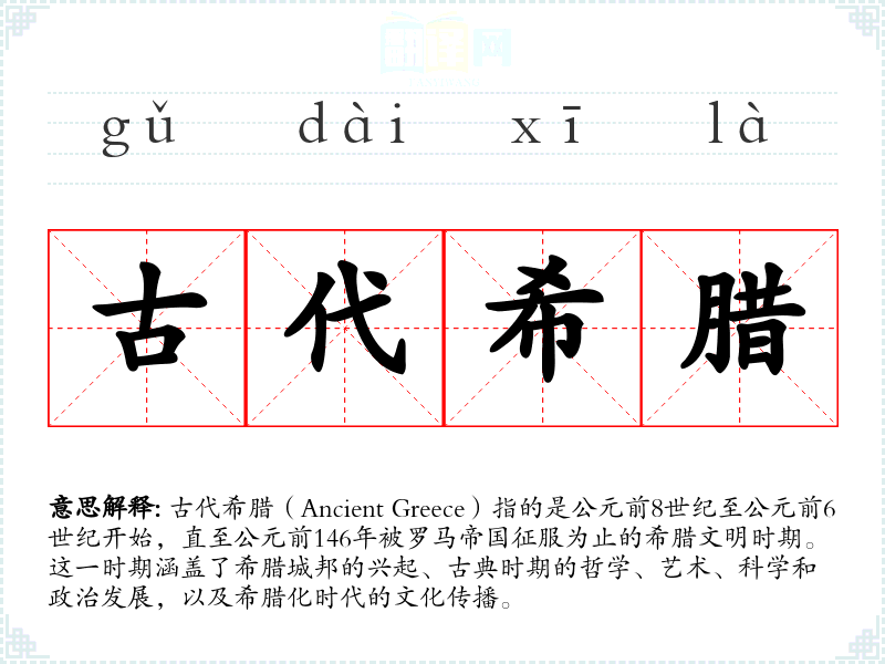 同义词:古典希腊(Classical Greece)、希腊古典时期(Greek Classical Period) 反义词:现代希腊(Modern Greece)、拜占庭希腊(Byzantine Greece)