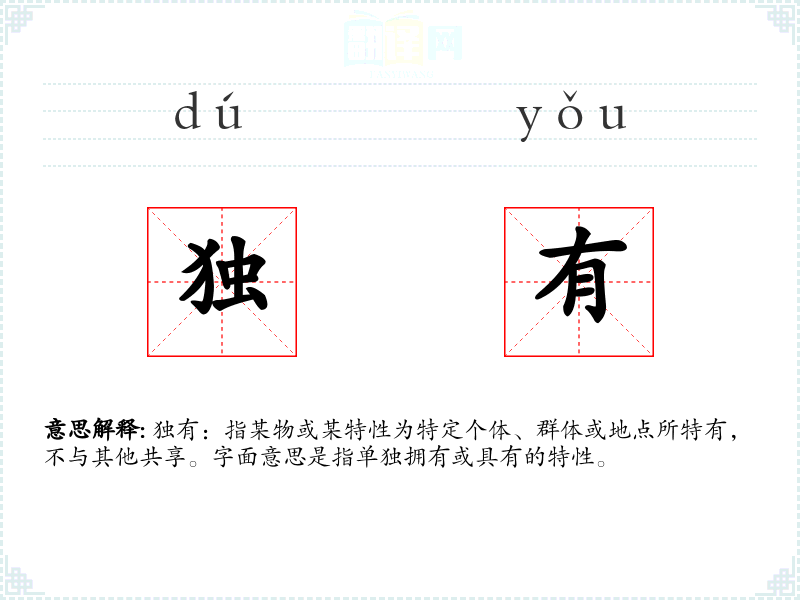 独有:指某物或某特性为特定个体、群体或地点所特有,不与其他共享。字面意思是指单独拥有或具有的特性。