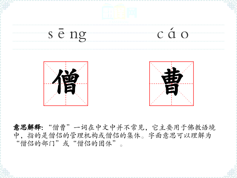 “僧曹”一词在中文中并不常见,它主要用于**语境中,指的是僧侣的管理机构或僧侣的集体。字面意思可以理解为“僧侣的部门”或“僧侣的团体”。