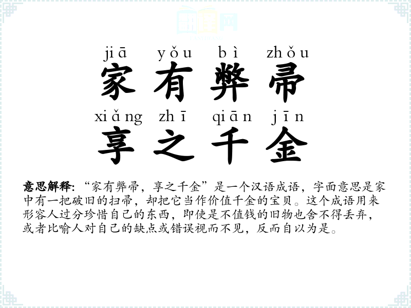 “家有弊帚,享之千金”是一个汉语成语,字面意思是家中有一把破旧的扫帚,却把它当作价值千金的宝贝。这个成语用来形容人过分珍惜自己的东西,即使是不值钱的旧物也舍不得丢弃,或者比喻人对自己的缺点或错误视而不见,反而自以为是。