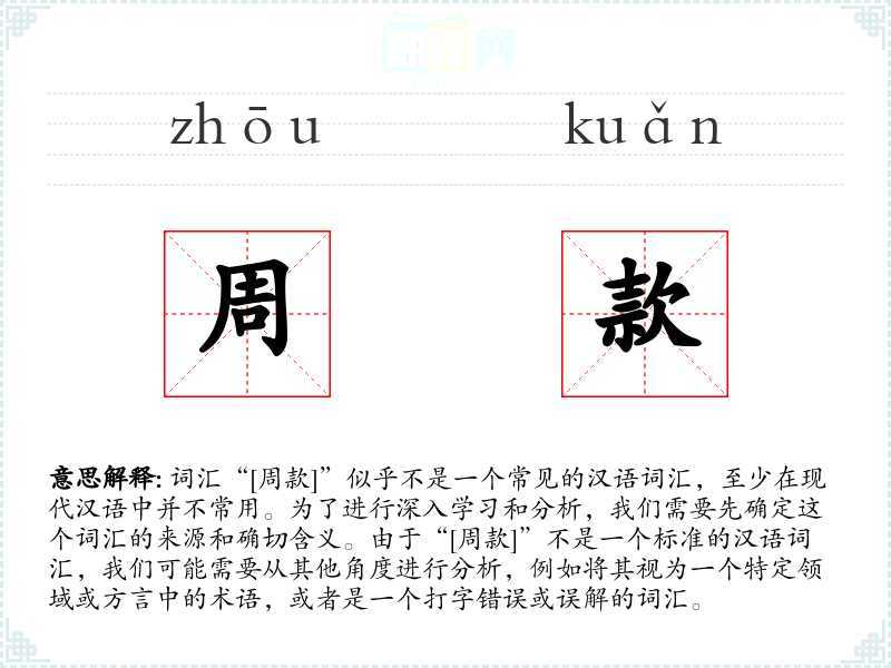 由于“[周款]”不是一个标准的汉语词汇,我们无法给出确切的基本定义。如果这是一个特定领域或方言中的术语,我们需要更多的上下文信息来确定其含义。