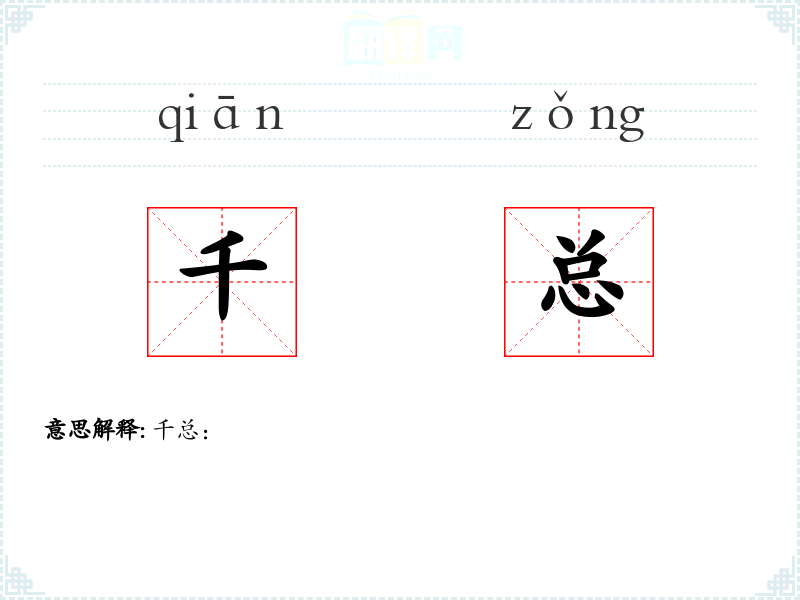 - 字面意思:字面上看,“千总”由“千”和“总”两个字组成。在古代汉语中,“千”表示数量,而“总”有统领、总管之意。