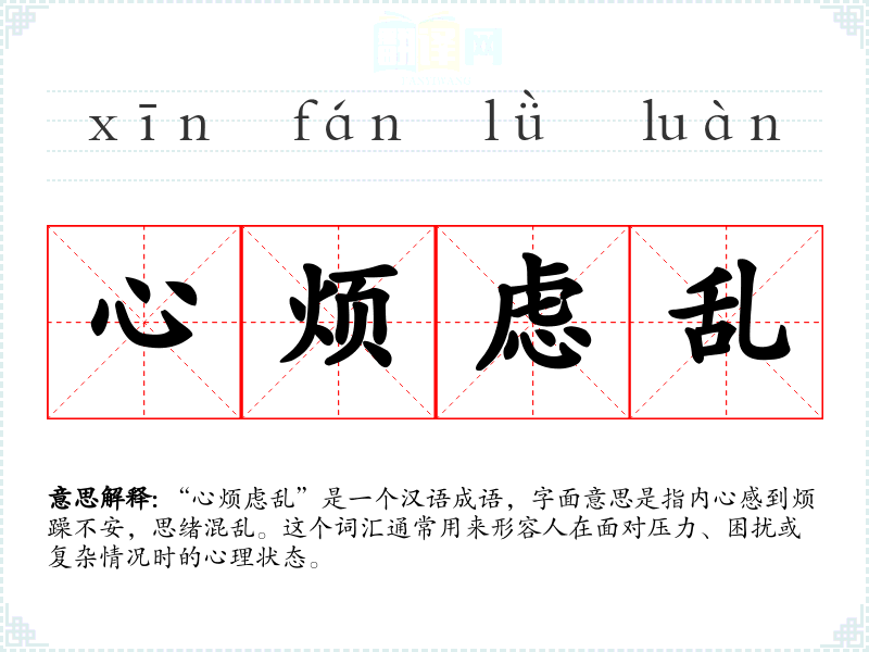- 口语语境:在日常对话中,人们可能会用“心烦虑乱”来形容自己或他人在面对工作压力、家庭问题等时的情绪状态。