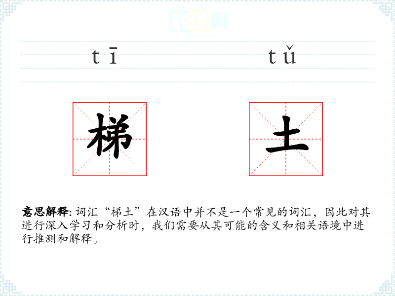 词汇“梯土”在汉语中并不是一个常见的词汇,因此对其进行深入学*和分析时,我们需要从其可能的含义和相关语境中进行推测和解释。