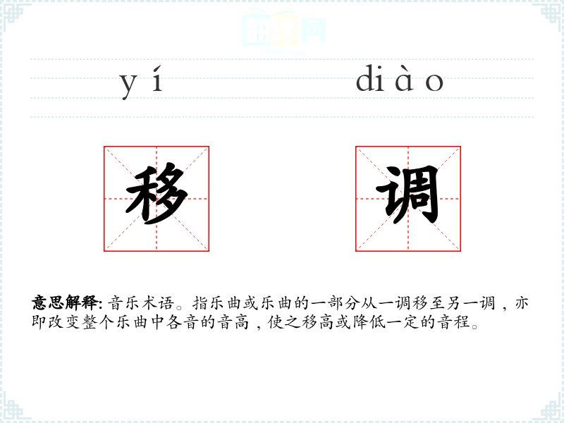 音乐术语。指乐曲或乐曲的一部分从一调移至另一调﹐亦即改变整个乐曲中各音的音高﹐使之移高或降低一定的音程。