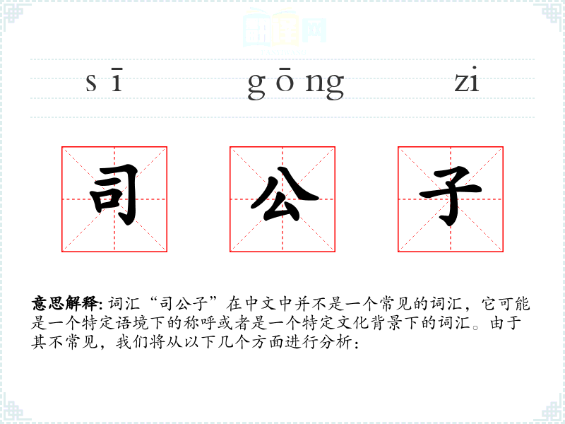 由于“司公子”不是一个常见的词汇,它的使用可能局限于特定的文学作品、历史文献或者某个特定的社群中。在文学作品中,它可能用来指代某个特定的角色,带有一定的文学色彩和历史背景。