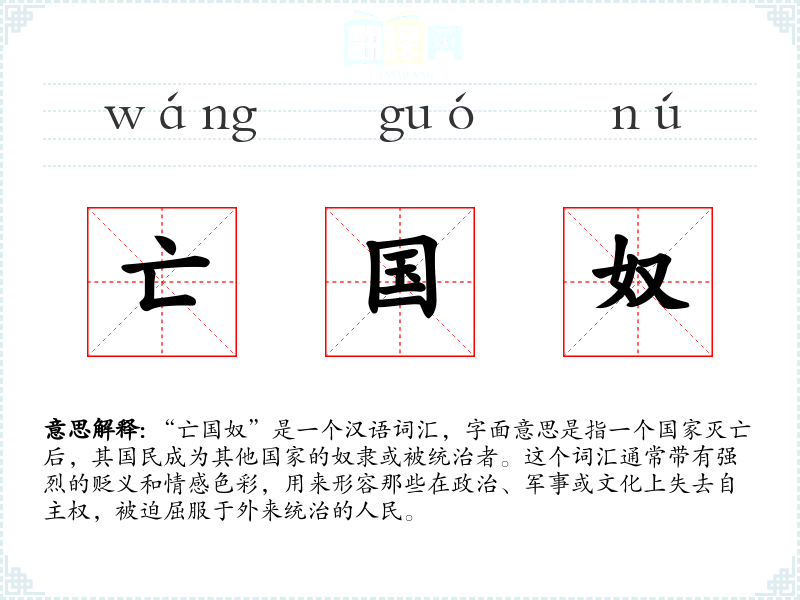 “亡国奴”是一个汉语词汇,字面意思是指一个国家灭亡后,其国民成为其他国家的奴隶或被统治者。这个词汇通常带有强烈的贬义和情感色彩,用来形容那些在政治、军事或文化上失去自主权,被迫屈服于外来统治的人民。