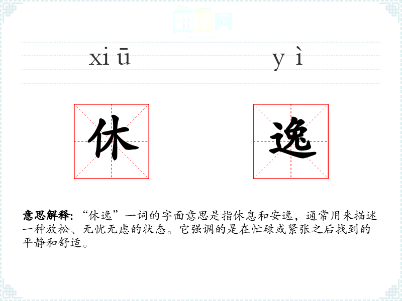 “休逸”一词的字面意思是指休息和安逸,通常用来描述一种放松、无忧无虑的状态。它强调的是在忙碌或紧张之后找到的平静和舒适。