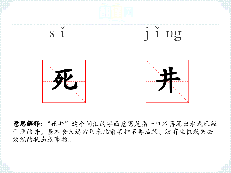 “死井”这个词汇的字面意思是指一口不再涌出水或已经干涸的井。基本含义通常用来比喻某种不再活跃、没有生机或失去效能的状态或事物。