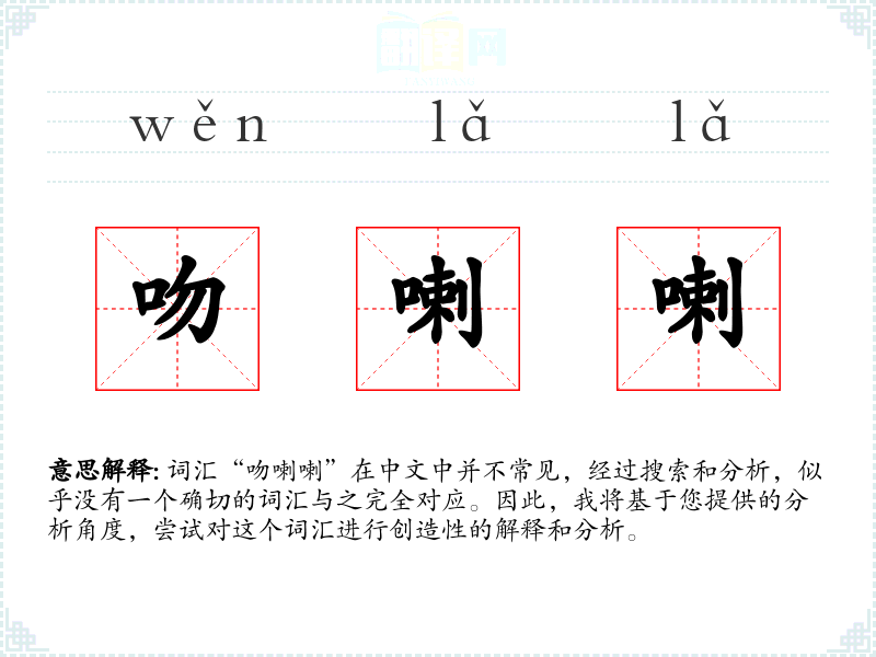 词汇“吻喇喇”在中文中并不常见,经过搜索和分析,似乎没有一个确切的词汇与之完全对应。因此,我将基于您提供的分析角度,尝试对这个词汇进行创造性的解释和分析。