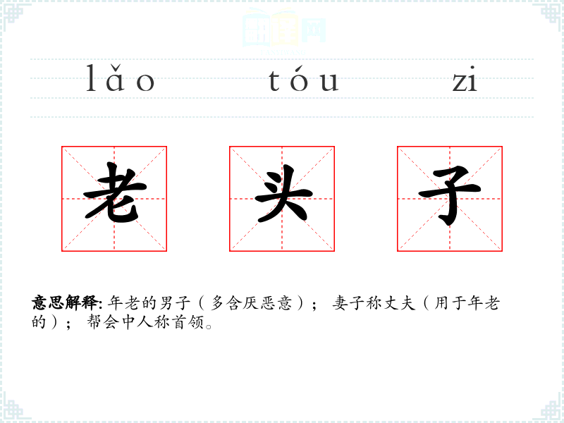 年老的男子(多含厌恶意); 妻子称丈夫(用于年老的); 帮会中人称首领。