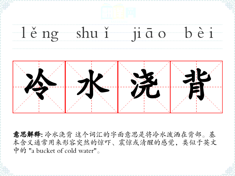 冷水浇背 这个词汇的字面意思是将冷水泼洒在背部。基本含义通常用来形容突然的惊吓、震惊或清醒的感觉,类似于英文中的 "a bucket of cold water"。