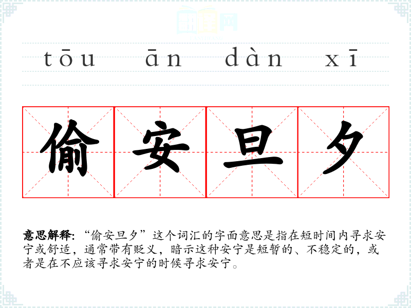 “偷安旦夕”这个词汇的字面意思是指在短时间内寻求安宁或舒适,通常带有贬义,暗示这种安宁是短暂的、不稳定的,或者是在不应该寻求安宁的时候寻求安宁。