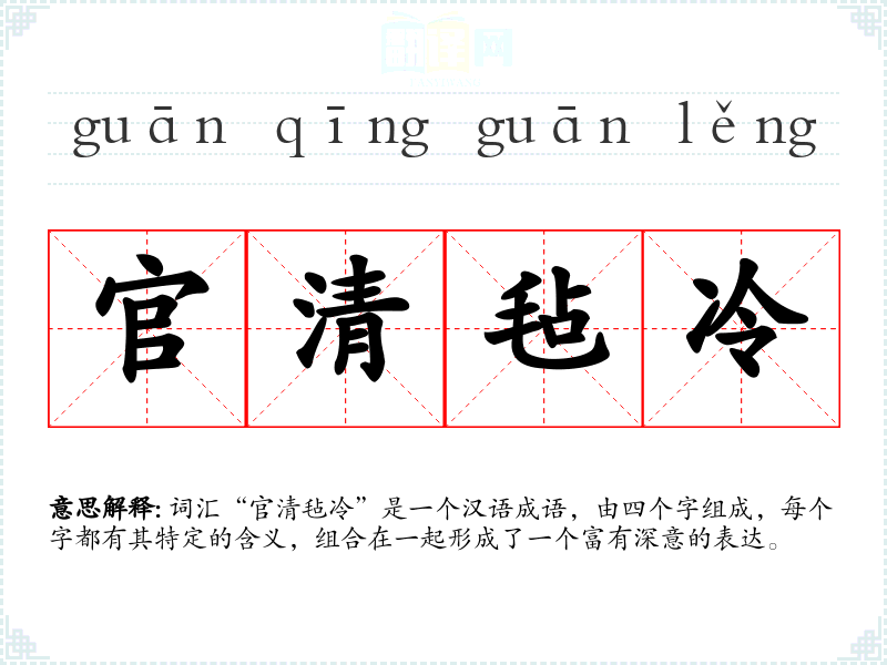 词汇“官清毡冷”是一个汉语成语,由四个字组成,每个字都有其特定的含义,组合在一起形成了一个富有深意的表达。
