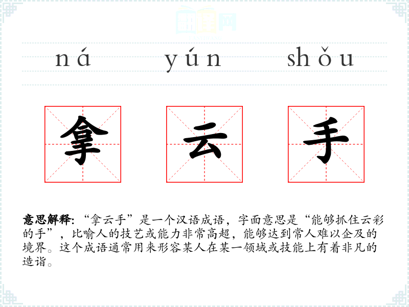 “拿云手”是一个汉语成语,字面意思是“能够抓住云彩的手”,比喻人的技艺或能力非常高超,能够达到常人难以企及的境界。这个成语通常用来形容某人在某一领域或技能上有着非凡的造诣。