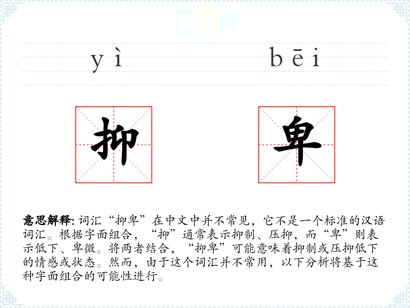 词汇“抑卑”在中文中并不常见,它不是一个标准的汉语词汇。根据字面组合,“抑”通常表示抑制、压抑,而“卑”则表示低下、卑微。将两者结合,“抑卑”可能意味着抑制或压抑低下的情感或状态。然而,由于这个词汇并不常用,以下分析将基于这种字面组合的可能性进行。