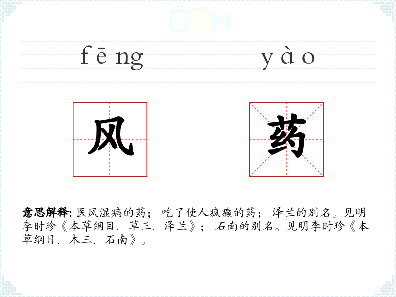 医风湿病的药; 吃了使人疯癫的药; 泽兰的别名。见明李时珍《本草纲目.草三.泽兰》; 石南的别名。见明李时珍《本草纲目.木三.石南》。