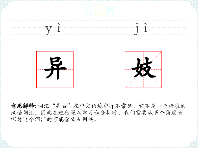 词汇“异妓”在中文语境中并不常见,它不是一个标准的汉语词汇,因此在进行深入学习和分析时,我们需要从多个角度来探讨这个词汇的可能含义和用法。