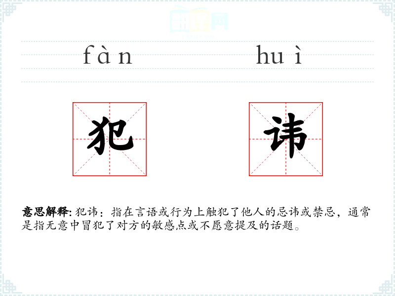 犯讳:指在言语或行为上触犯了他人的忌讳或禁忌,通常是指无意中冒犯了对方的敏感点或不愿意提及的话题。