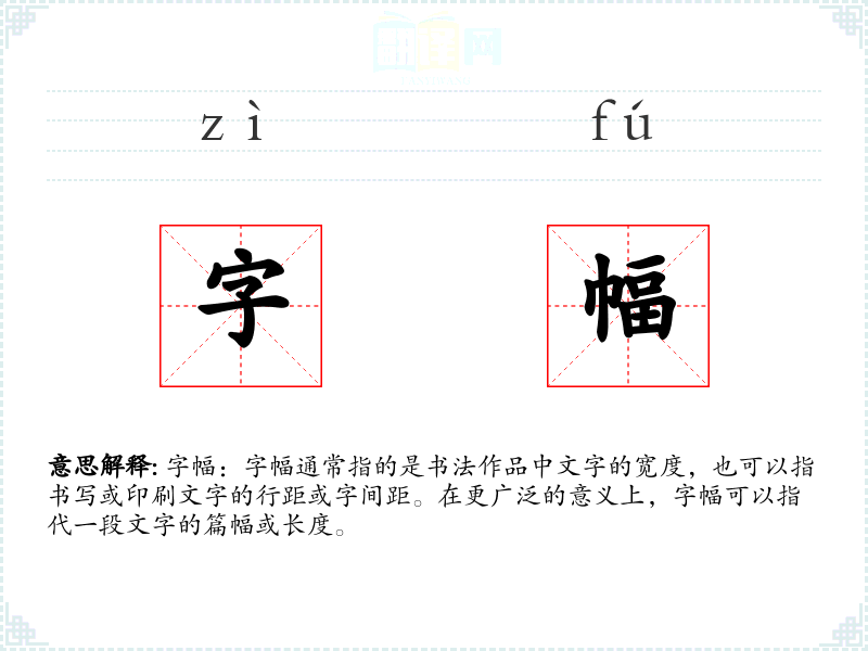 字幅:字幅通常指的是书法作品中文字的宽度,也可以指书写或印刷文字的行距或字间距。在更广泛的意义上,字幅可以指代一段文字的篇幅或长度。
