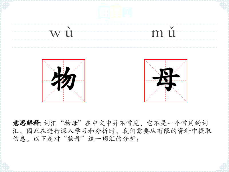 词汇“物母”在中文中并不常见,它不是一个常用的词汇,因此在进行深入学*和分析时,我们需要从有限的资料中提取信息。以下是对“物母”这一词汇的分析: