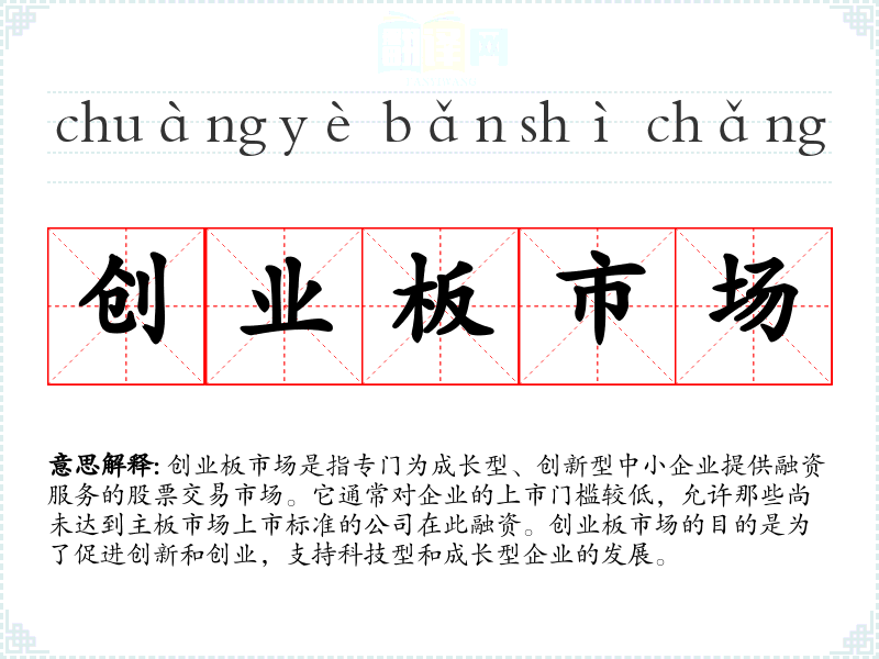 创业板市场是一个重要的金融术语,它不仅代表了股票交易的一个特定板块,也反映了社会对创新和创业的支持。了解和掌握这个词汇对于金融和经济领域的学*者来说是非常重要的。