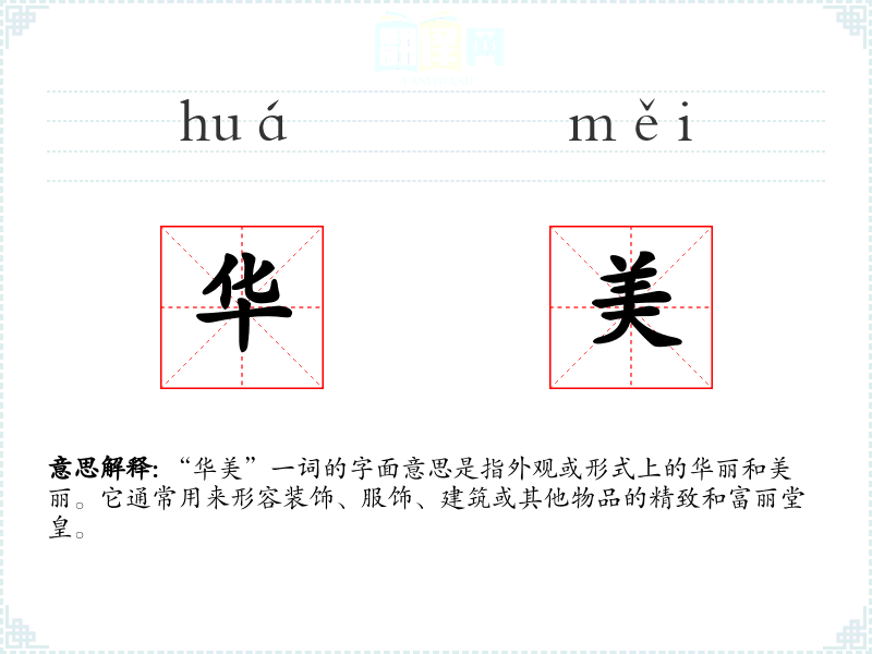 “华美”一词的字面意思是指外观或形式上的华丽和美丽。它通常用来形容装饰、服饰、建筑或其他物品的精致和富丽堂皇。