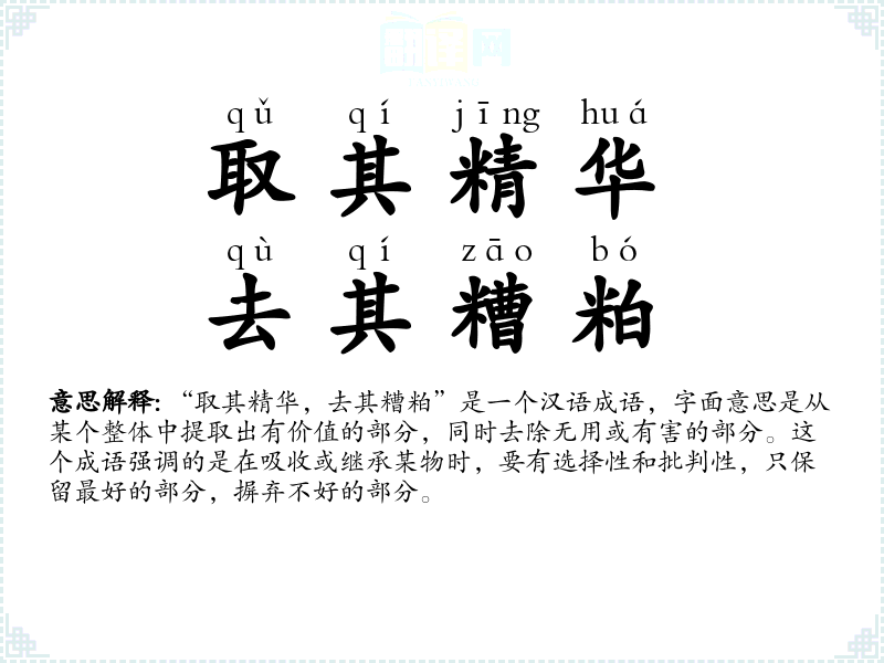- qù qí zāo pò,cún qí jīng huá去其糟粕,存其精华